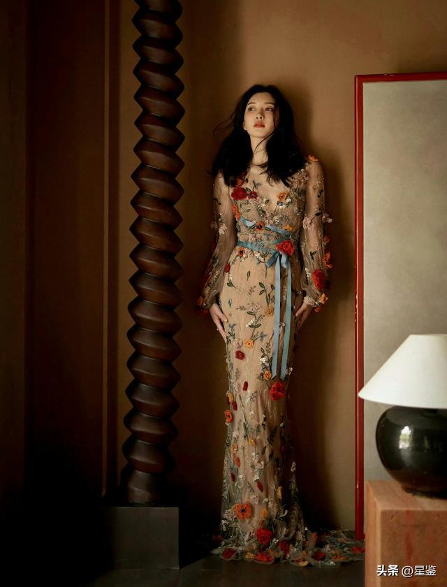 江疏影这组造型,完全就是从复古油画里走出来的人间富贵花。一条裸色透视纱裙,被她穿出了自带柔光滤镜的高级感,连光影都在为她的气质加分。